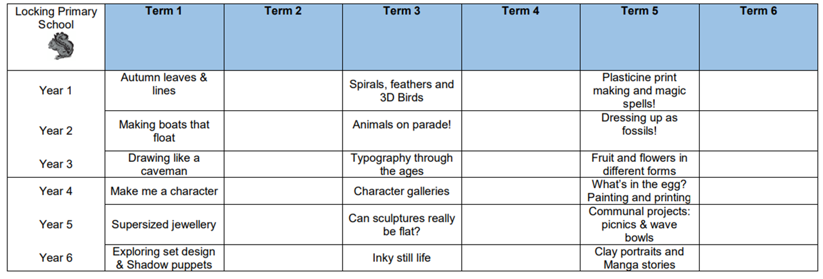 Our vision at Locking, through the teaching of Art and Design, is for our children to become confident, independent artists who can articulate and value their own creative journeys. Our art curriculum fires their imagination. Children are encouraged to take creative risks, develop personal expression and to learn from their journey.