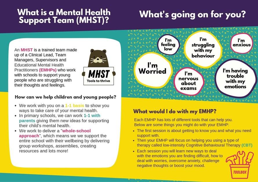 - dedicated and trained staff to support children who are worried about their mental health and services that we can refer children to for further support and help with their emotional and mental health.