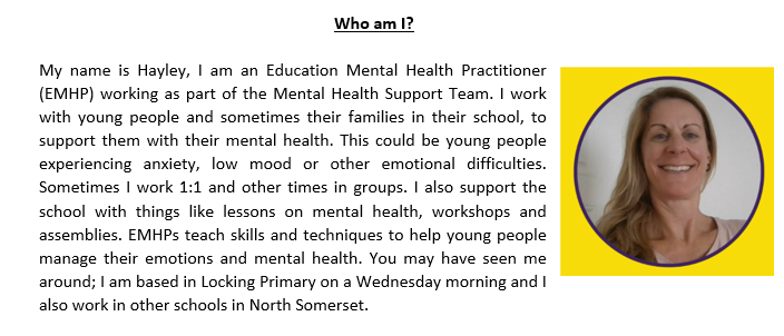At Locking we work closely with The Mental Health Support Team and as a result we have secured an EMHP that is a trained practitioner that can support identified pupils with mental health needs. Hayley is in school every Wednesday and conducts 1-1 therapies as well as small group interventions.